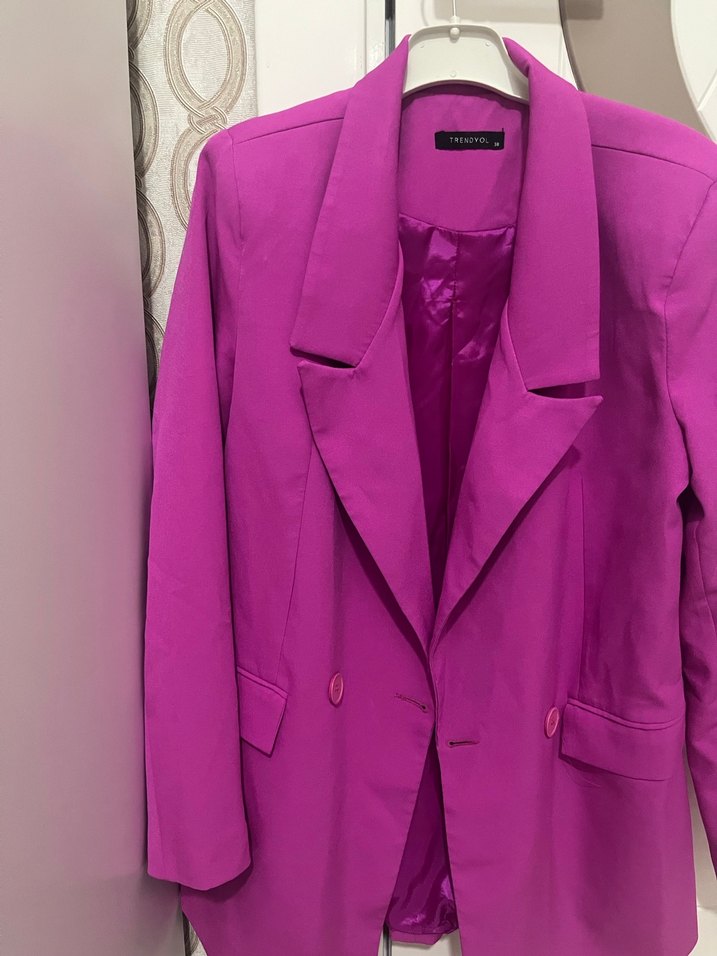 Mor kadın blazer, düğmeli ve notched lapel yakaya sahip. İpek gibi dokusu, regular fit ve askılı kollarıyla ofis ve günlük kullanıma uygun midi uzunlukta.
