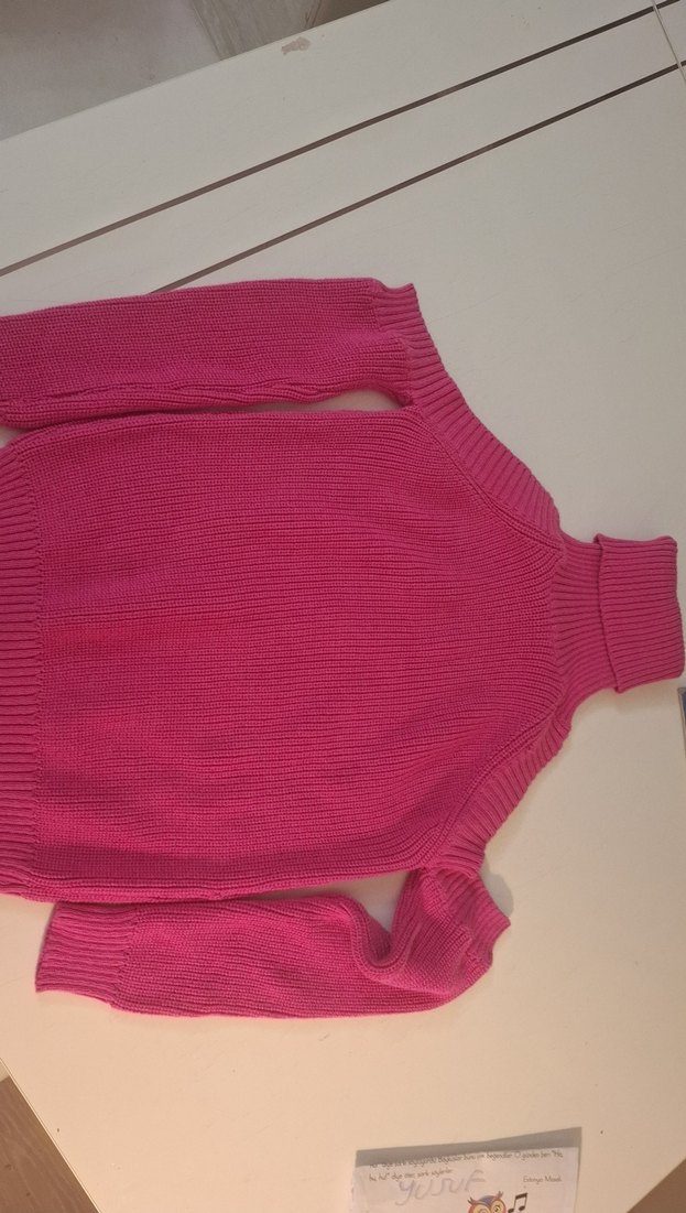Pembe, boğazlı, uzun kollu, triko dokulu, vücuda oturan kadın kazak. Normal midi boyda, sade ve rahat tasarımıyla günlük sokak stiline uygun.