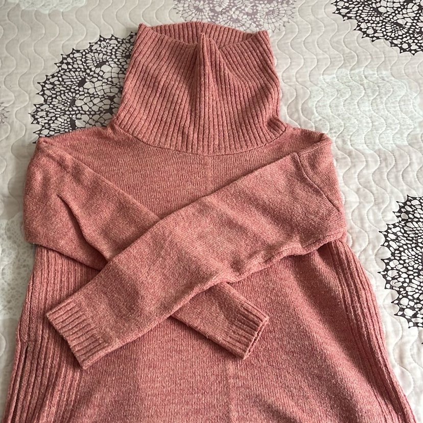 Pembe, boğazlı, uzun kollu, ince triko kazak. Rahat ve sıcak dokusuyla gündelik kullanıma uygun, biraz uzundur arkasi önüne gore daha uzun yanlari fermuarli