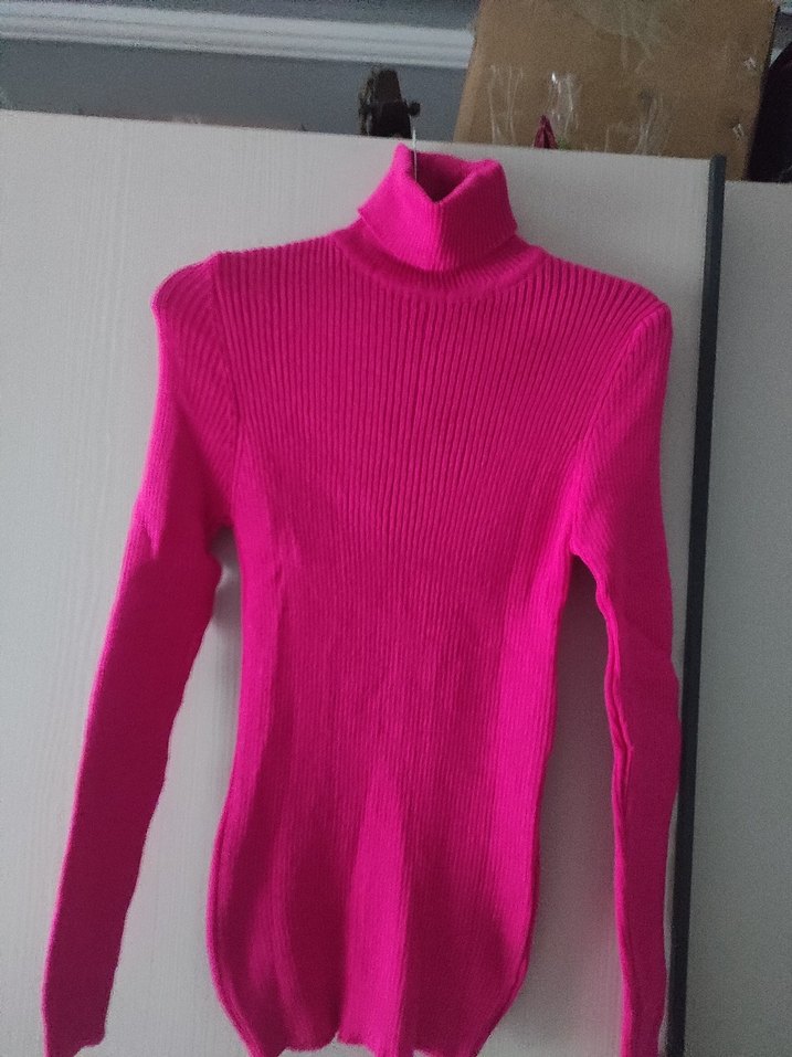 Pembe boğazlı, uzun kollu, fitted triko kazak. Rahat ve renkli, günlük kullanıma uygun midi uzunlukta, trend sokak stili kazak.