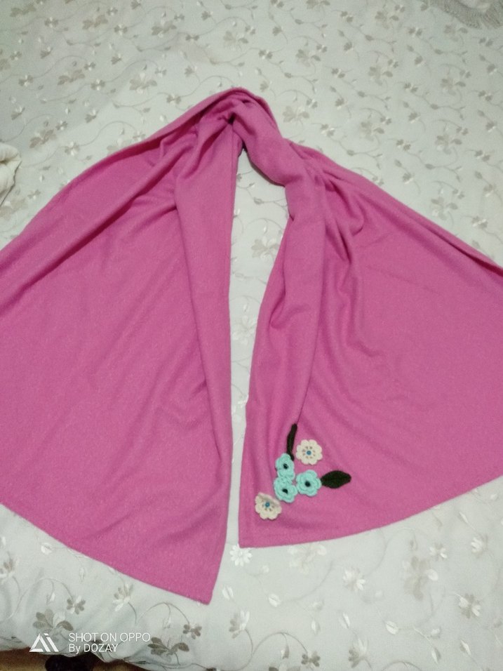 Yumuşak ve rahat pembe atkı, bohem dokunuş için küçük çiçek işlemeleriyle. Canlı ve retro görünüme uygun.