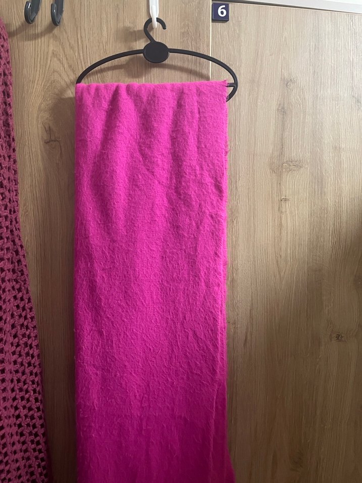 Parlak pembe renkte, drapeli tasarıma sahip yumuşak ve sıcak dokulu kadın şalı. Bohem tarz için uygundur.