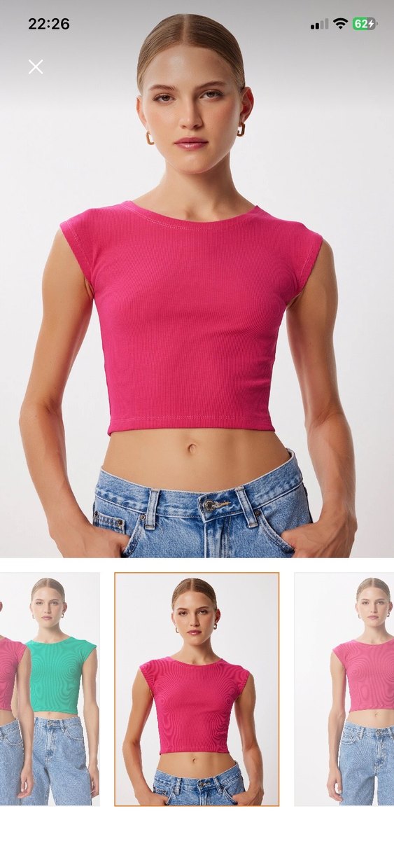 Pembe renkli, yuvarlak yakalı ve kolsuz kadın crop top, dar kesim ve denim kumaştan üretilmiştir. Günlük kullanıma uygun, rahat ve şık bir modeldir.