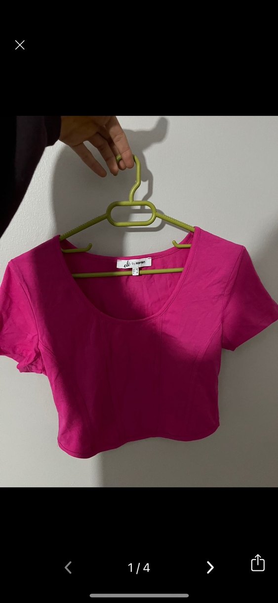 Pembe, dar kesim crop top, yuvarlak yaka ve kısa kollu. Yumuşak sentetik kumaştan, pastel renk ve baskılı desene sahip, günlük kullanıma uygun cesur sokak stili.
