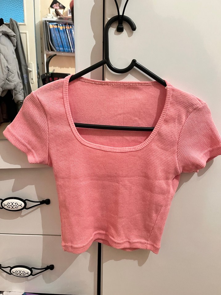 Pembe renkli kadın crop top, yuvarlak yaka ve kısa kolludur. Yumuşak sentetik kumaştan, rahat ve şık bir görünüm sunar.