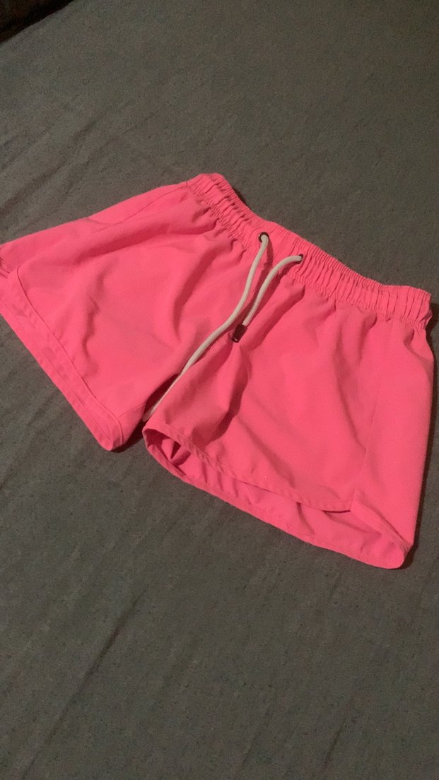 Pembe renk, sentetik kumaştan yapılmış, bol kesim ve mini boy kadın deniz şortu xxs kız çocuk için de uygundur hiç giyilmedi