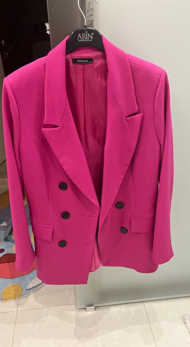 Pembe renkli, düğmeli, uzun kollu kadın blazer ceket. Notch yakalı, parlak sentetik kumaştan, midi boyda, rahat kesim.2 kez giyildi 0 ayarında