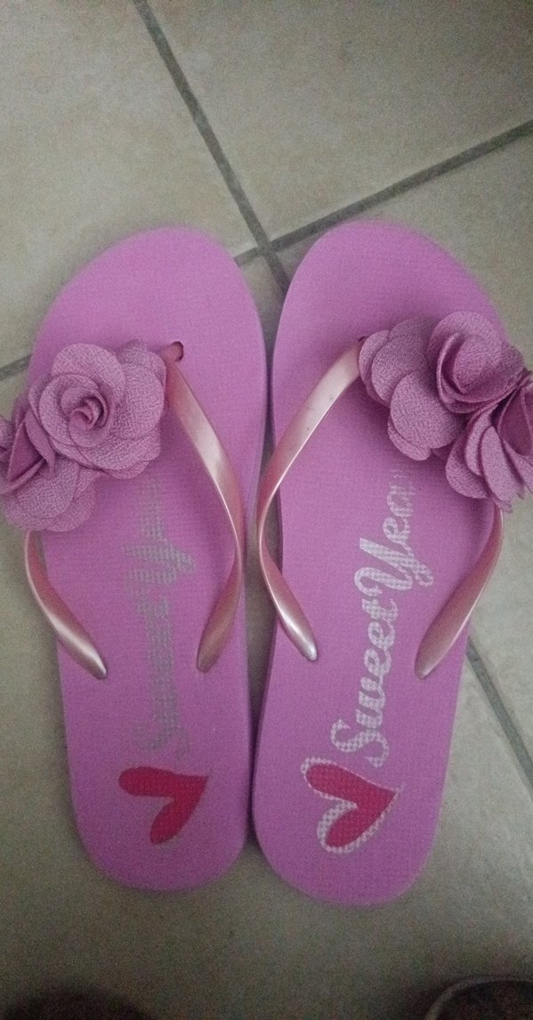 Pembe renkli, yumuşak kauçuk malzemeden yapılmış, çiçekli fırfır detaylı, düğün için uygun, minimalist bohem tarzda dolgu topuklu kadın terlikleri.