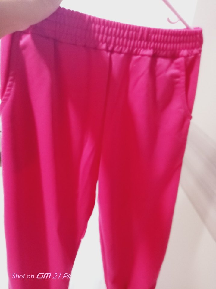 Pembe renkli, elastik bel bantlı, midi boyda, sentetik kumaştan yapılmış, spor ve streetwear tarzına uygun kadın pantolonudur.