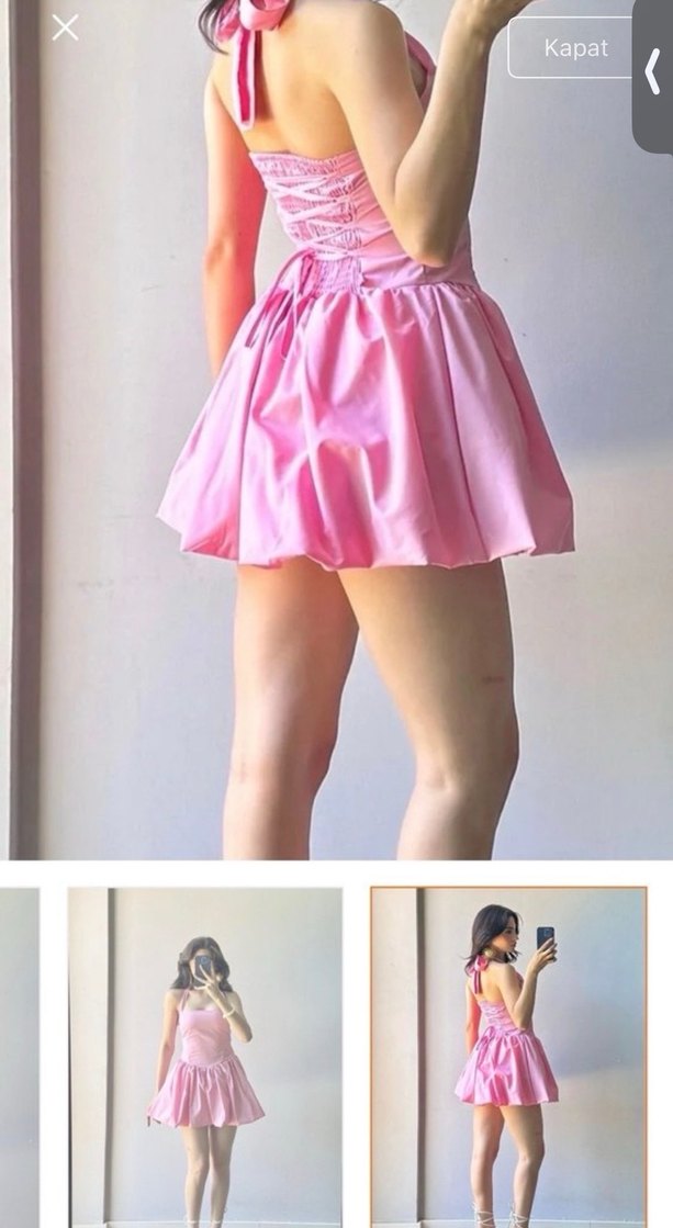 Pembe renkte, straplez yakalı ve pilili etekli, sentetik kumaştan yapılmış, vücuda oturan midi elbisedir. Minimalist ve cesur tarzda, parti için uygundur.