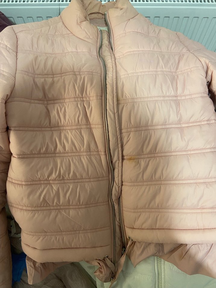 Pembe renkte, fermuarlı, midi boyda kadın mont. Sentetik kumaştan, rahat ve şık sokak stili için uygun, yakası kesik ve askılı kollu pileli altı kusurları fotoğrafta gösterilmiştir.