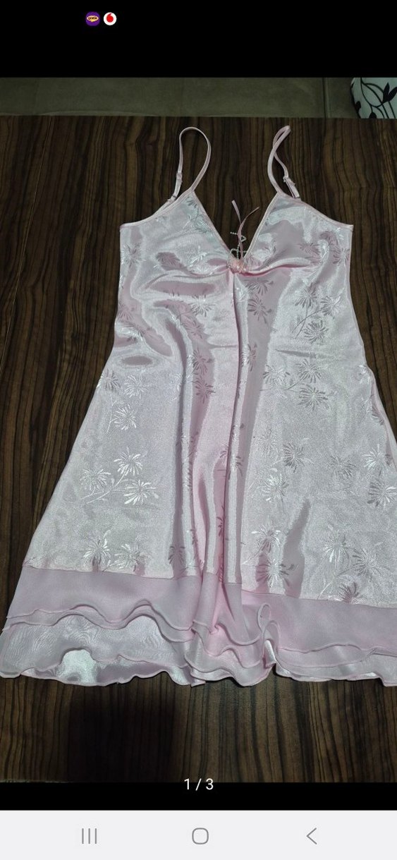 İnce askılı, pembe renkli, çiçek desenleriyle süslenmiş gecelik hiç kullanılmadı