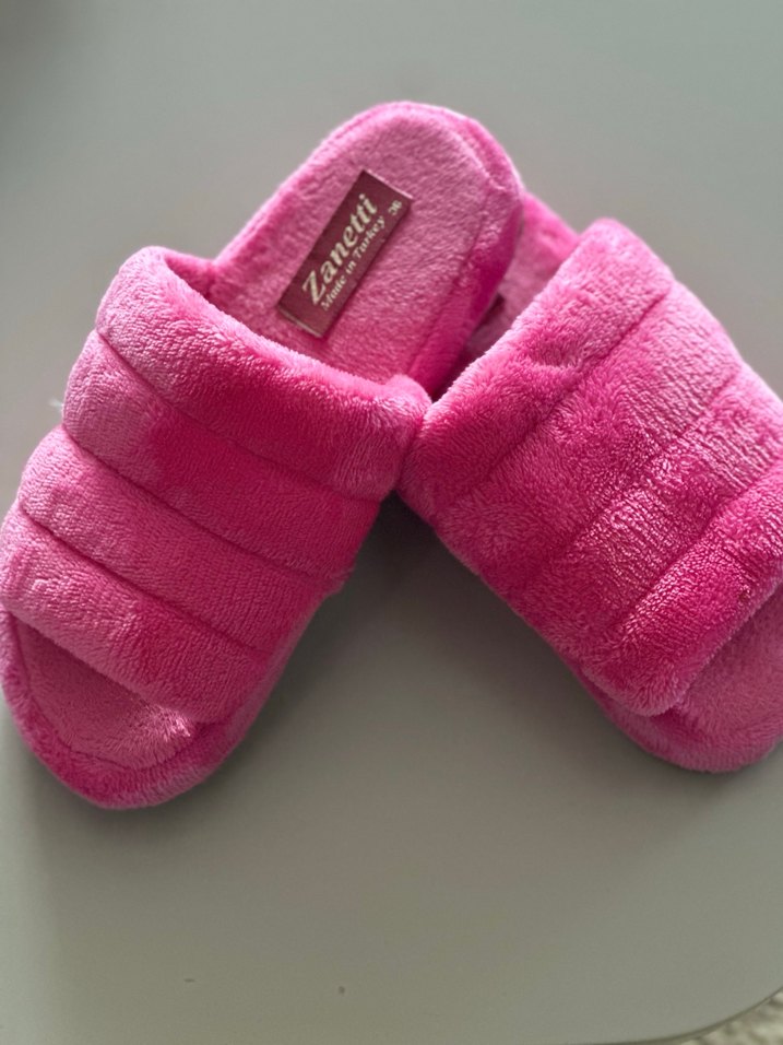 Pembe kadife terlikler, yumuşak ve pileli üst yüzeyli, konforlu günlük kullanım için dolgu topuklu.