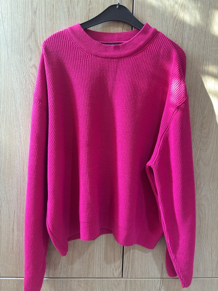 Pembe renkli, örgü yapıda, yuvarlak yaka ve uzun kollu, yumuşak ve sıcak kumaştan, rahat kesim ve normal boyda kadın sweatshirtü.