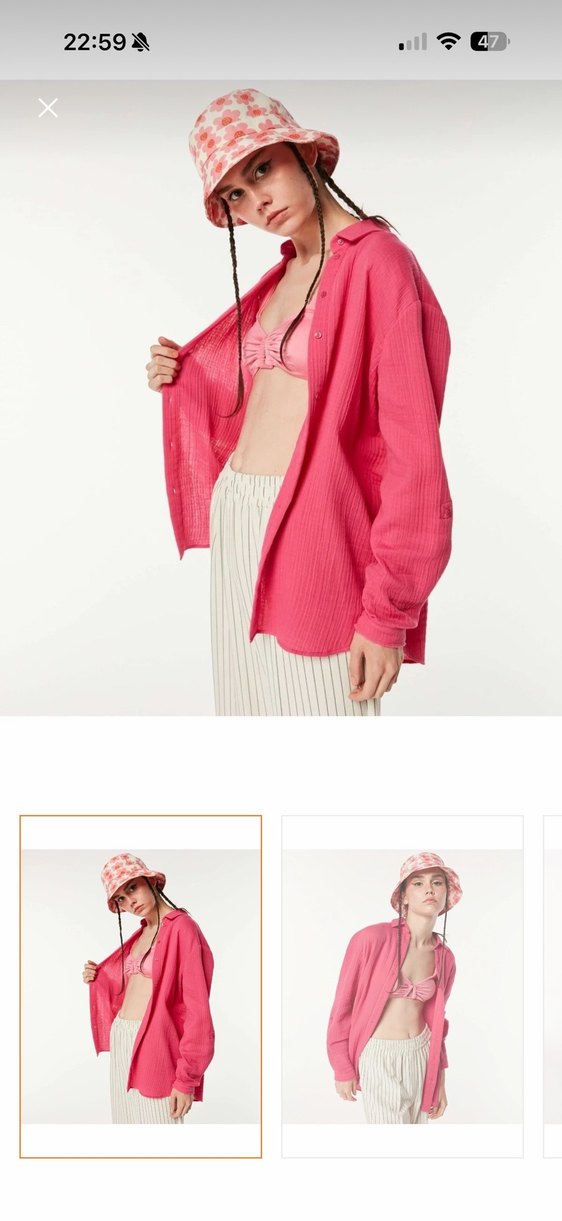 Açık pembe keten kumaştan, bol kesim ve uzun kollu gömlek. Tek renk, kayık yaka ve rahat, günlük kullanıma uygun tarzda.