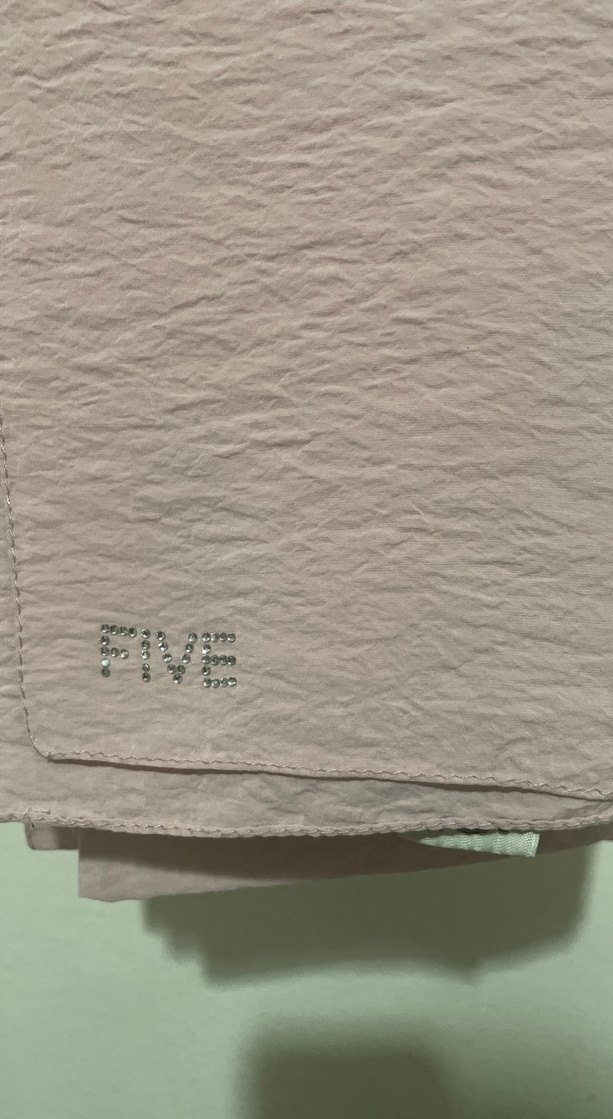 Pembe renkli keten kumaştan yapılmış kadın şalı, üzerinde 'FIVE' yazan payet detayları bulunur. Minimalist ve normcore tarza uygundur.