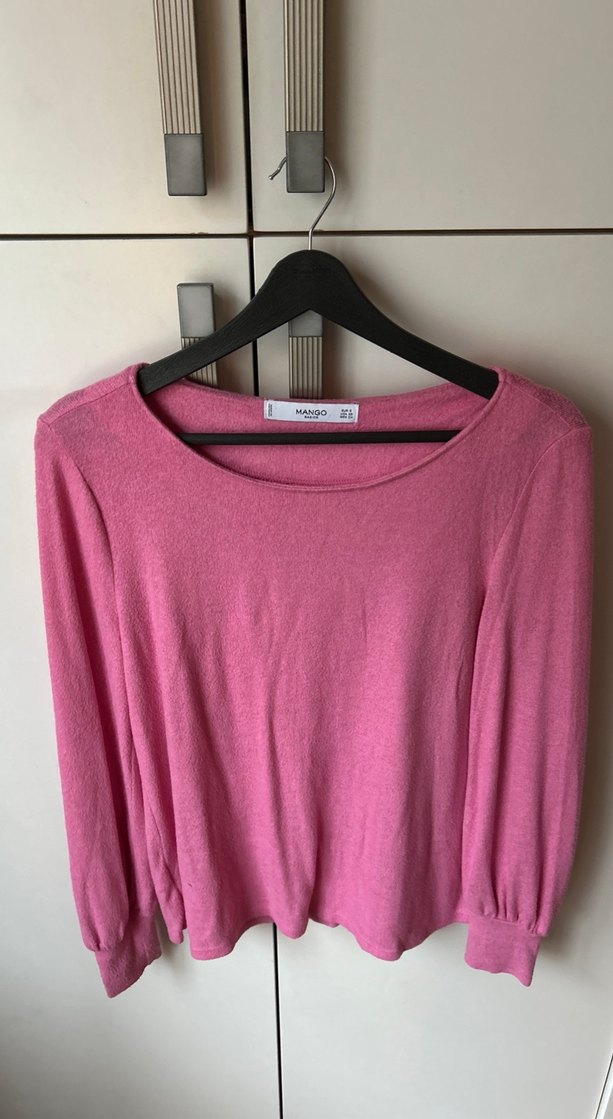 Pembe keten kumaştan, yuvarlak yaka ve uzun kollu, bol kesim basic kazak, günlük kullanıma uygun pastel minimalist tarzda.