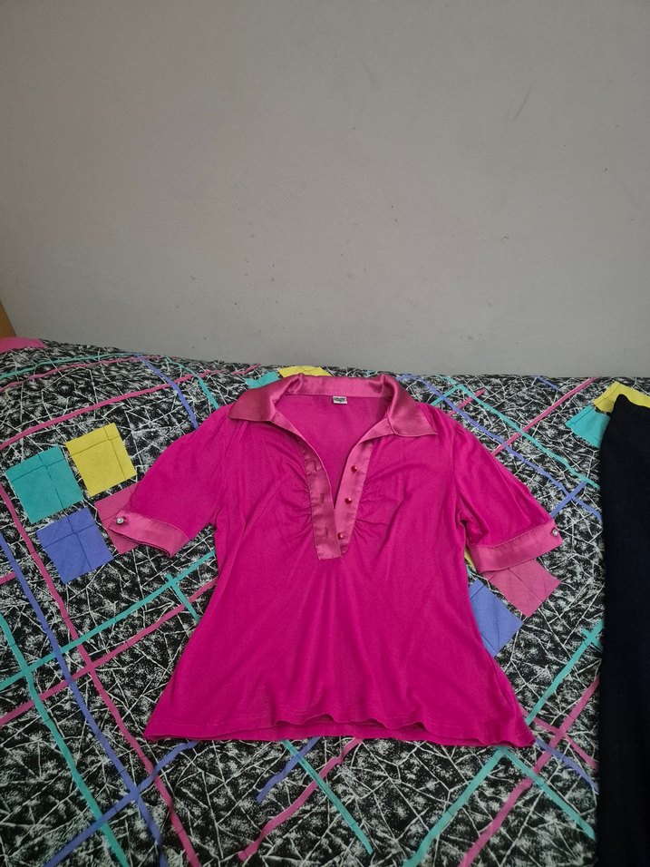 Renkli bağlama desenli, düğmeli, yakalı, kısa kollu, bol kesim pembe kadın gömleği, sentetik kumaştan.