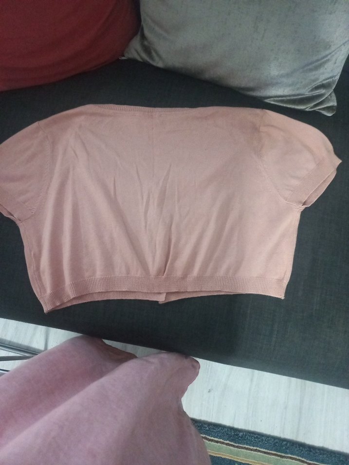 pembe renkte, kısa kollu kısa kesim kadın bolera Yumuşak sentetik kumaştan, minimal ve normcore tarzda günlük kullanım için uygun.