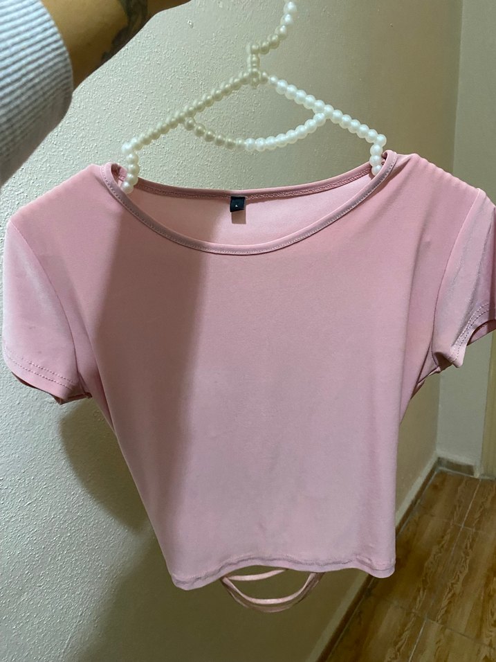 Pembe, kısa kollu, yuvarlak yakalı ve vücuda oturan crop top. Yumuşak sentetik kumaştan üretilmiş, günlük rahat sokak stili için uygun. Arkası lastikli şık bir durusu vardır