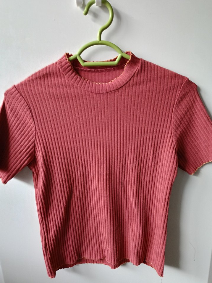 Pembe renkli kadın tişörtü, kısa kollu ve yuvarlak yakalıdır. Fitilli dokusu ve sentetik kumaşıyla günlük kullanıma uygundur.