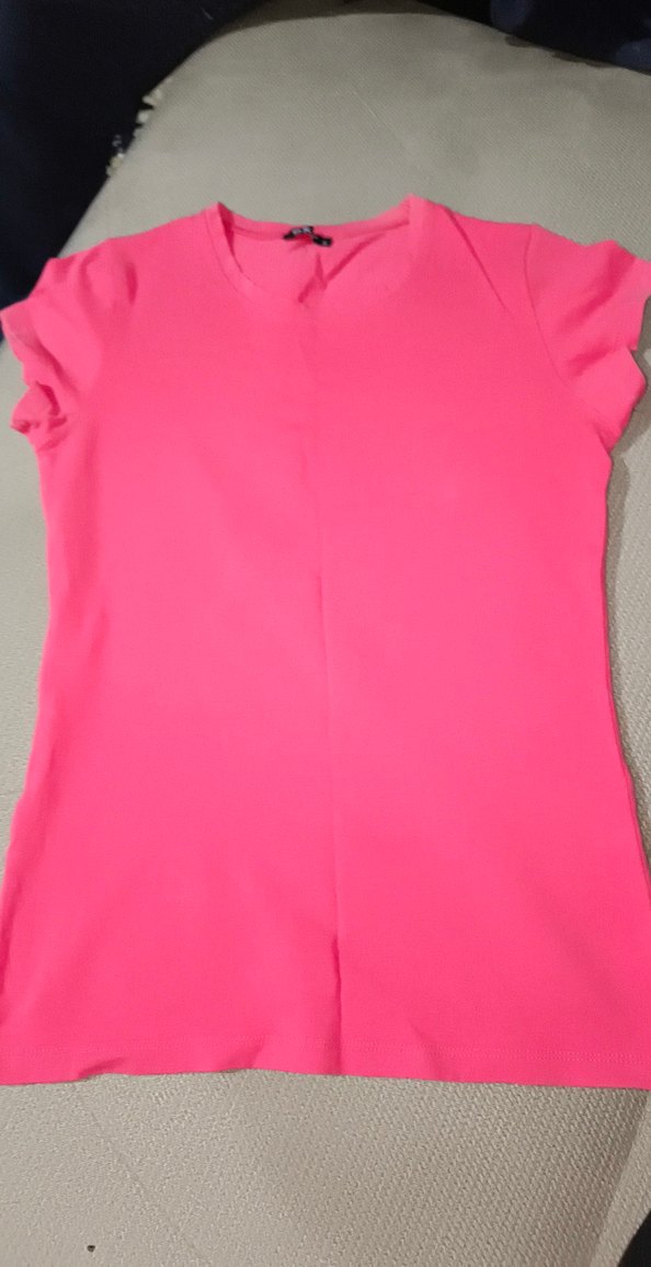 Pembe renkli, kısa kollu ve bisiklet yaka kadın tişörtü. Sentetik kumaştan üretilmiş, rahat ve şık bir günlük tercih.
