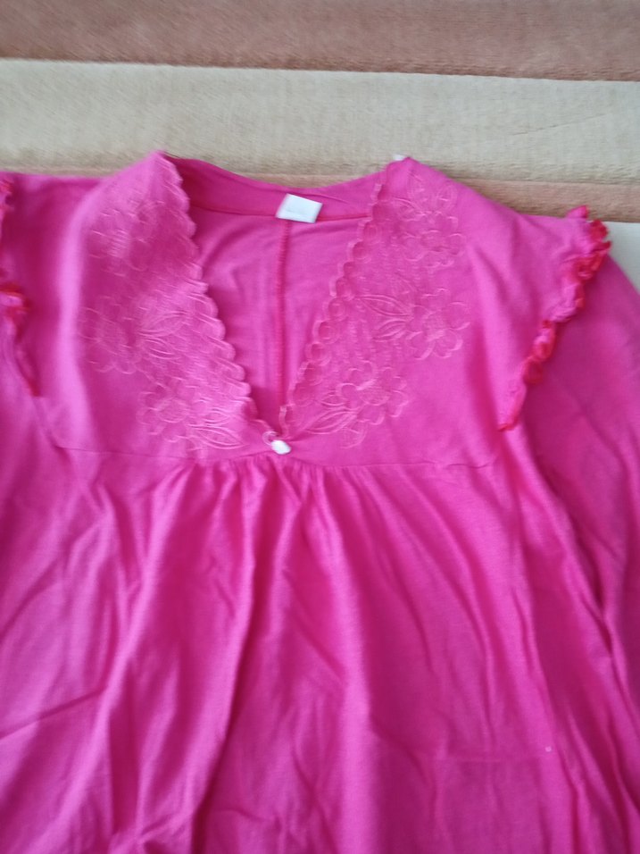 Pembe renkte, kısa kollu ve bol kesim uzun gecelik. Yumuşak kumaştan, yakada zarif çiçek işlemeleri bulunur.