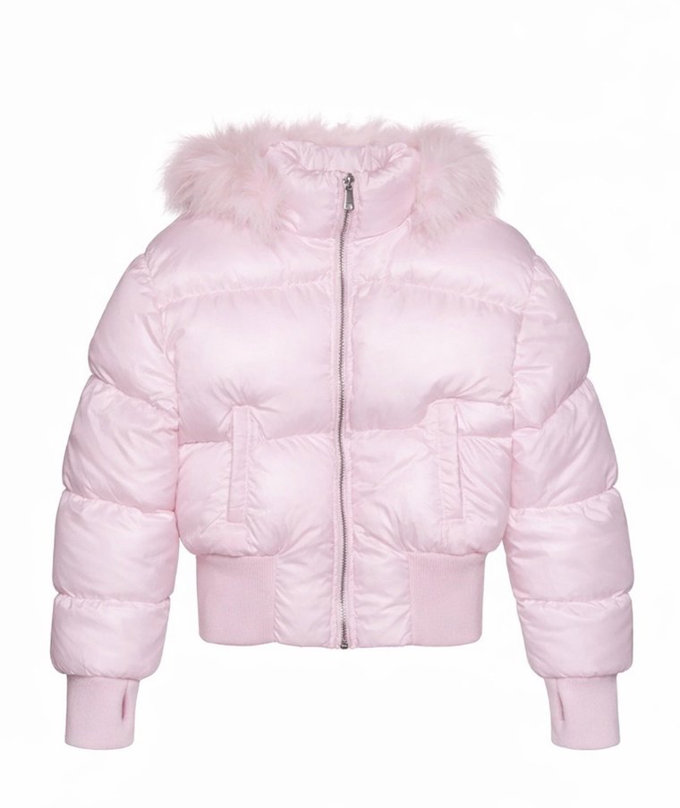 Pembe tonlarında, kürk detaylı ve yüksek yakalı, uzun kollu fitted kesim denim kışlık mont. Günlük kullanıma uygun sokak stili tarzında.