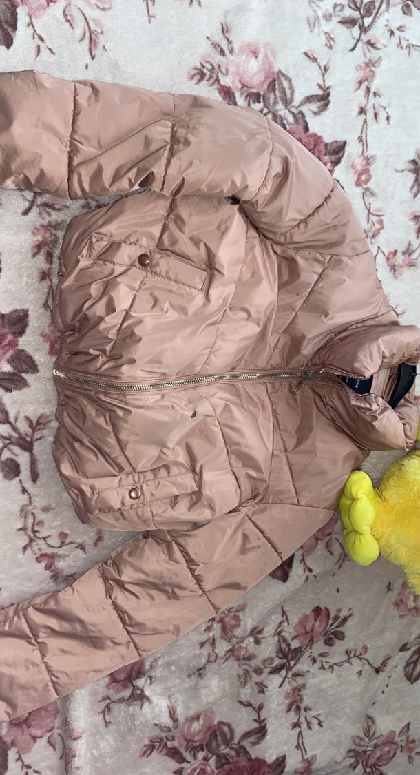 Pembe pastel renkte, kürklü boğazlı ve uzun kollu, rahat kesim kadın kışlık mont. Sentetik yumuşak kumaştan, midi boyda, günlük kullanıma uygun.