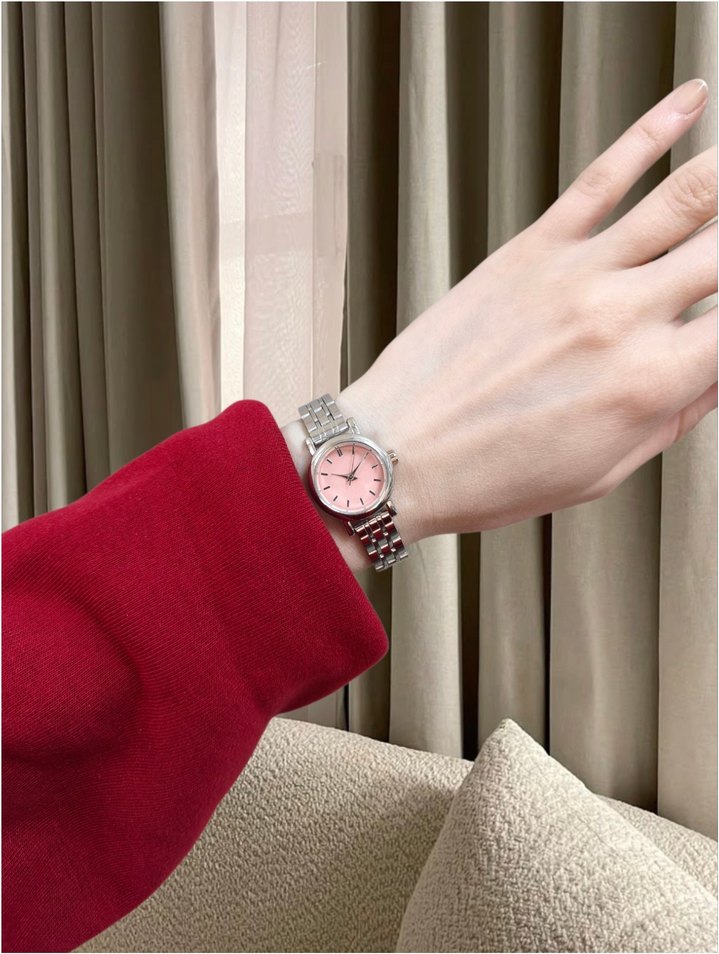 Pembe pastel kadranlı, düğmeli gümüş renk metal kayışlı kadın kol saati, rahat ve çağdaş tarzı bir araya getirir. ⌚