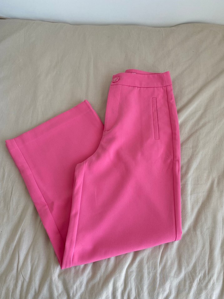 Pembe renkli, regular fit kadın kumaş pantolon. Düz desensiz, minimal ve normcore tarzıyla günlük kullanıma uygun.
