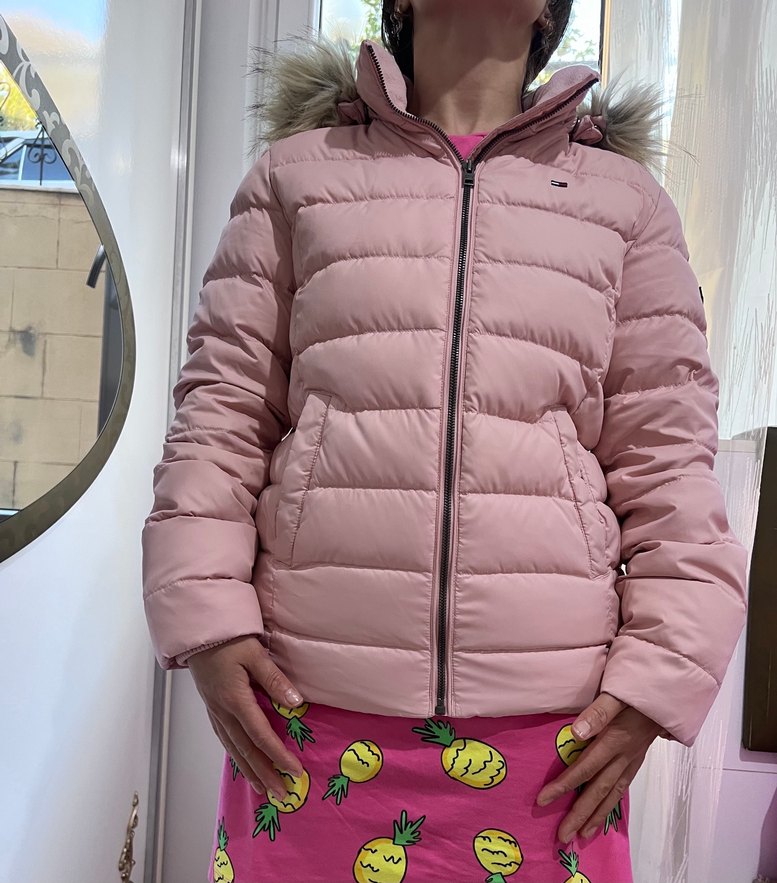 Bu pembe, vücuda oturan mont yüksek yaka ve kapüşon detayında kürk içerir. Yumuşak sentetik kumaştan yapılmış, günlük sokak tarzı için uygun.