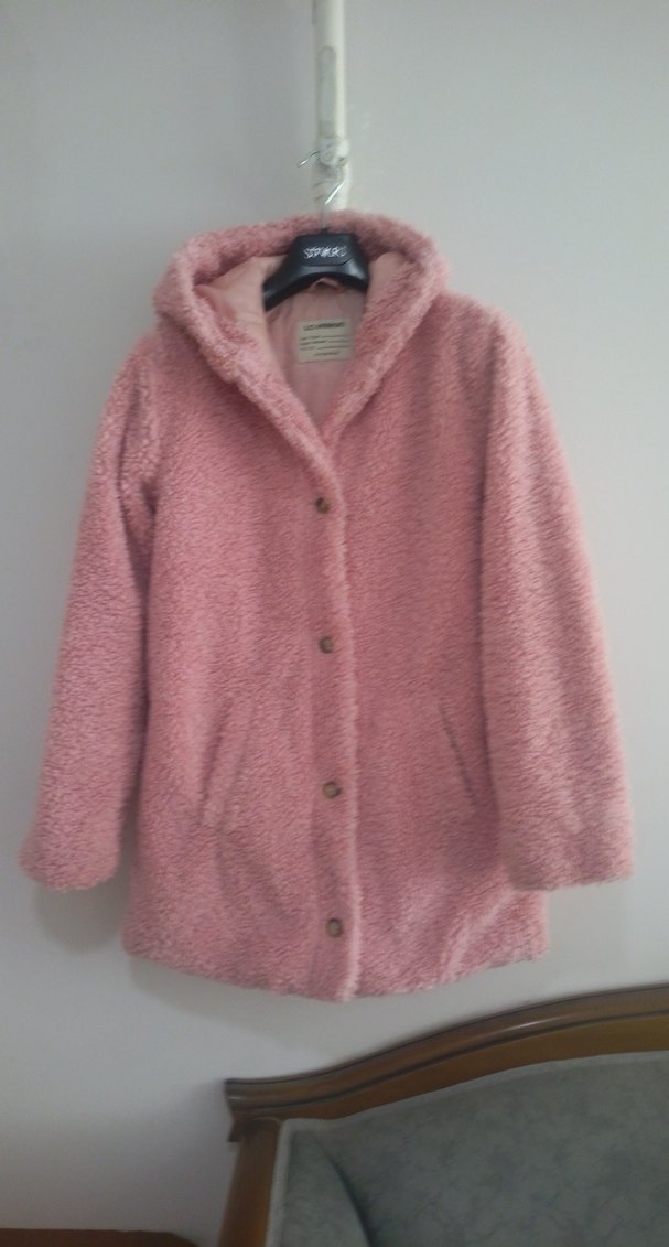 Pembe, midi boy kadın mont, yumuşak kürklü dokusu, kesik yakası ve uzun kollu. Rahat kesimiyle trend günlük stil için uygun.