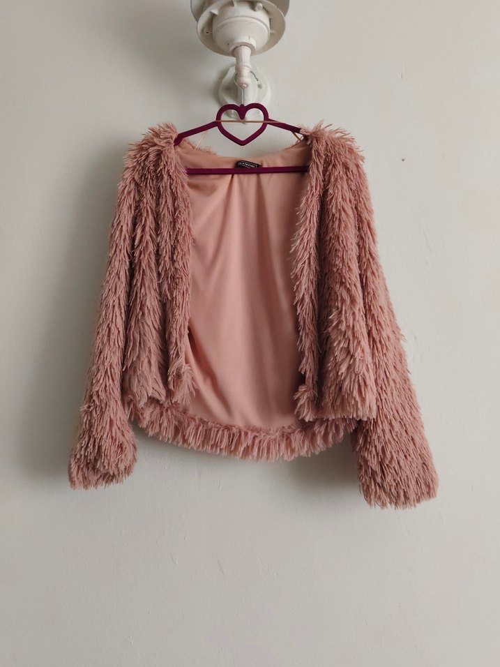 Pembe renkli, midi boy, uzun kollu, suni kürk detaylı kadın ceket. Straplez yakalı, dar kesim ve yumuşak sentetik kumaştan üretilmiştir. Günlük kullanıma uygundur.