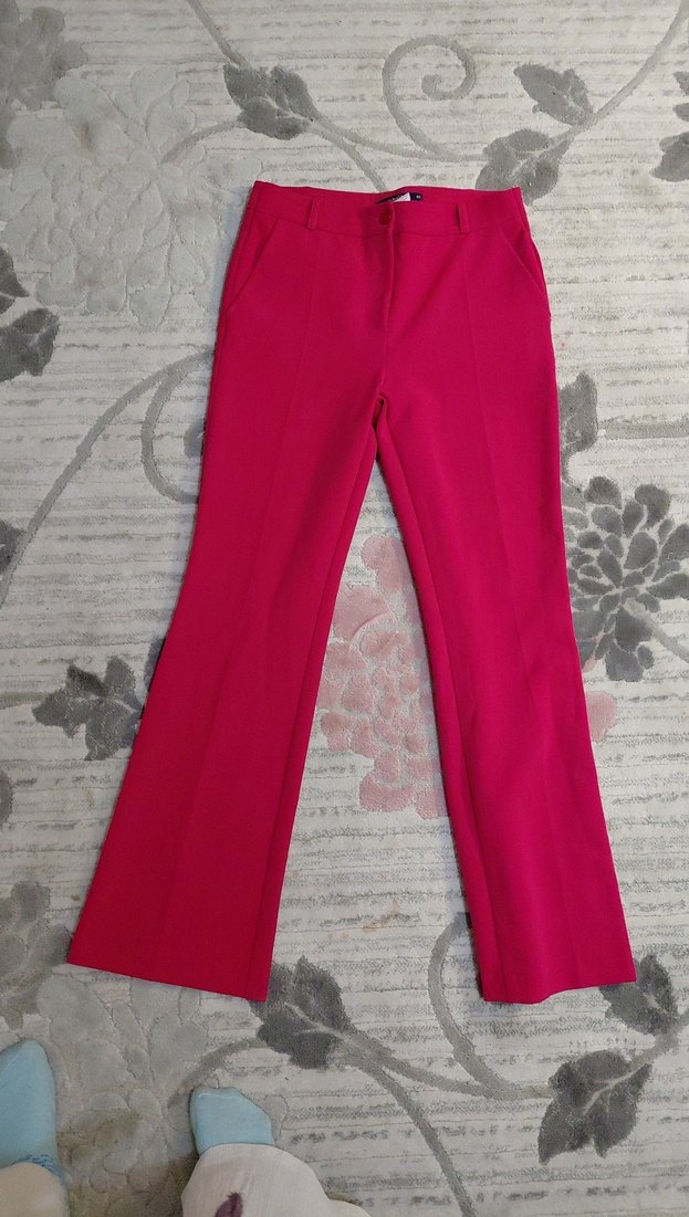 Pembe renkli, regular fit, midi boy kadın kumaş pantolon. Sentetik kumaştan üretilmiş, fermuarlı detaya sahip. Günlük kullanıma uygun, trend sokak giyimi tarzında.