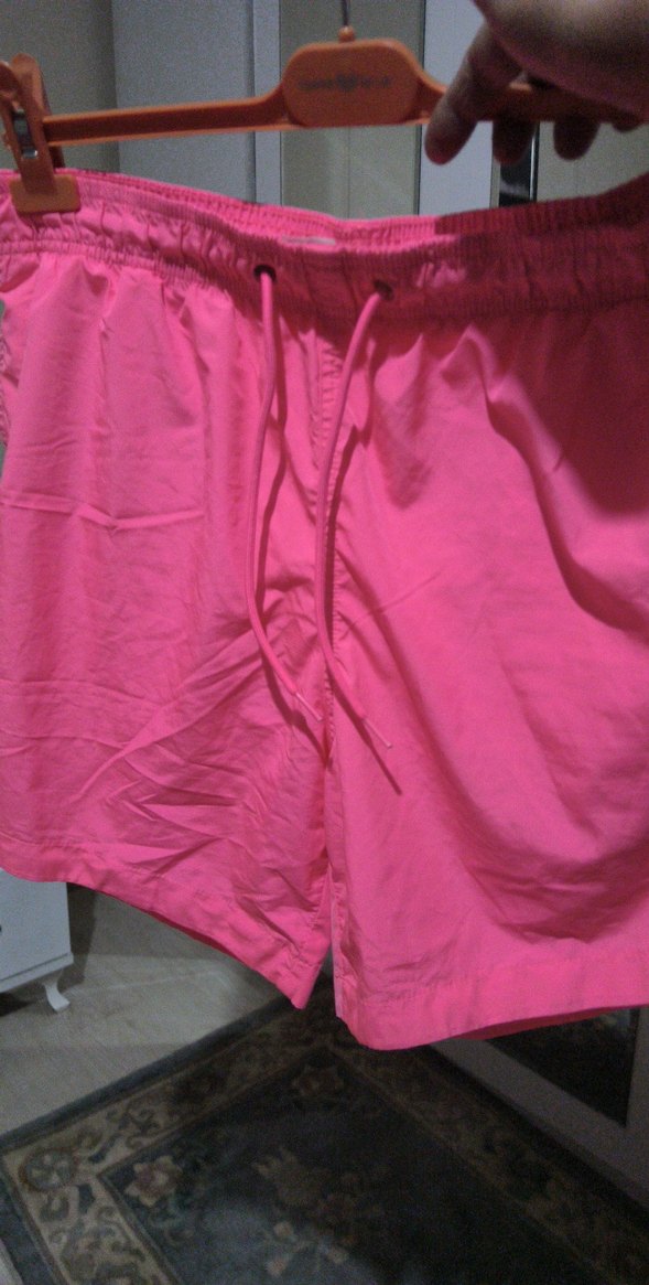 Pembe parlak renkte, drapeli tasarıma sahip, belden lastikli ve bağcıklı kadinmidi yüzme şortu, rahat kesim ve plaj için uygun.