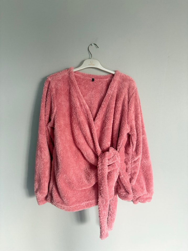 Pembe renkli, uzun kollu, bol kesim mini bornoz. Yumuşak ve sıcak kumaştan, belde bağlama detayı bulunur. Pastel tonlarda rahat bir model.