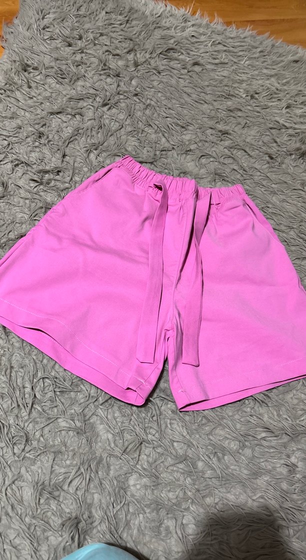 Yumuşak ve sıcak kumaştan, lastikli bağcıklı rahat kesim pembe mini şort. Günlük kullanıma uygun sade tasarım. Hiç giyilmedi etiket üstünde
