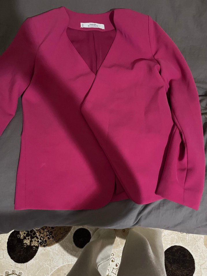 Pembe renkte, normal kesim ve midi boyda kadın blazer. Uzun kollu, düğmeli ön kısmı ve keskin yakasıyla ofis için uygun.