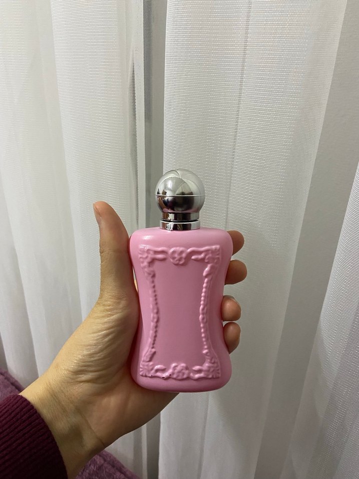 Kabartmalı çerçeveli pembe kadın parfüm şişesi, gümüş yuvarlak kapaklı, şık ve pürüzsüz yüzeyli.