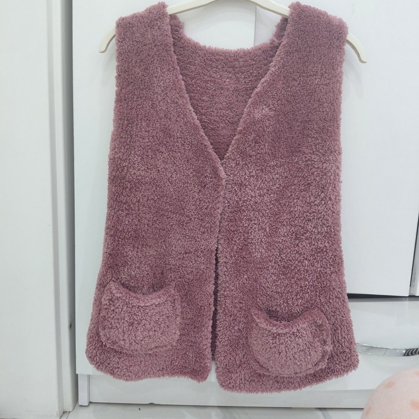V yakalı, kolsuz, yumuşak kürk detaylı pembe kadın yelek. İki ön cepli, gevşek kesim, günlük kullanıma uygun bohem tarzda.