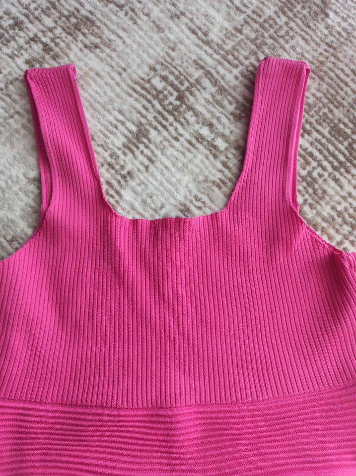 Pembe renkli, pilili detaylı ve tek renk, kadınlar için vücuda oturan atlet. Tekne yaka ve kolsuz tasarıma sahiptir, spor ve athleisure tarzına uygundur.