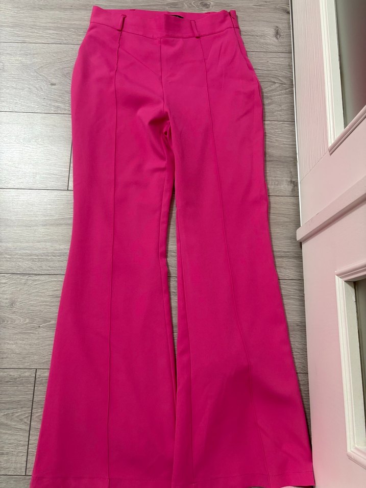 Kadınlar için pembe, pilili, parlak sentetik kumaştan yapılmış, normal kesim ve uzun boy kumaş pantolon. Ofis kullanımı için uygun, cesur ve minimalist tarzda. Ürünün kusuru görseldeki gibi belli belirsiz bi mürekkep lekesi var boy uzunluğu 107 cm iç astarlıdır