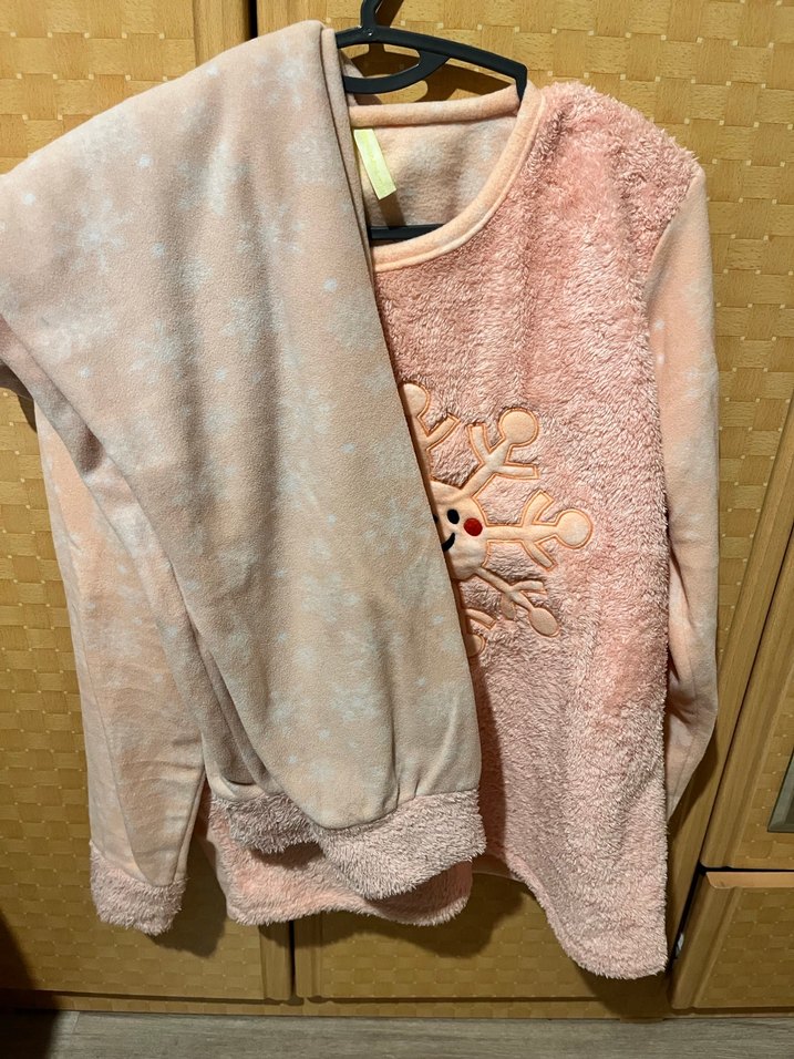 Pembe pastel renkte, uzun kollu ve midi boyda, yumuşak ve rahat kumaştan üretilmiş bol kesim kadın pijama takımı. Üst kısmında kar tanesi deseni bulunur. ❄️