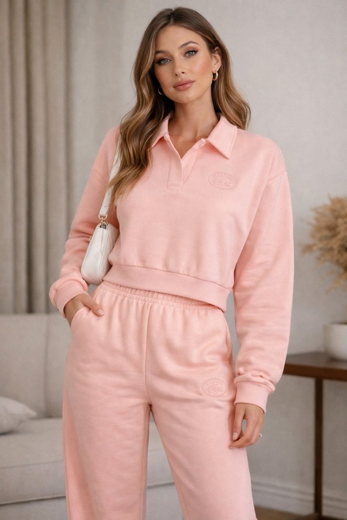 Pembe pastel renkte, uzun kollu ve yuvarlak yakalı, rahat kesim kadın eşofman takımı. Yumuşak ve sıcak kumaştan, gündelik kullanım için sade ve şık.