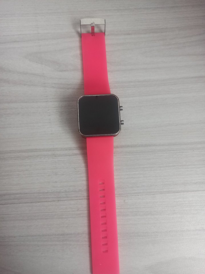 Renkli pembe kayışlı, tokalı, siyah kare kadranlı kadın saati. Spor ve sade tasarıma sahiptir. ⌚