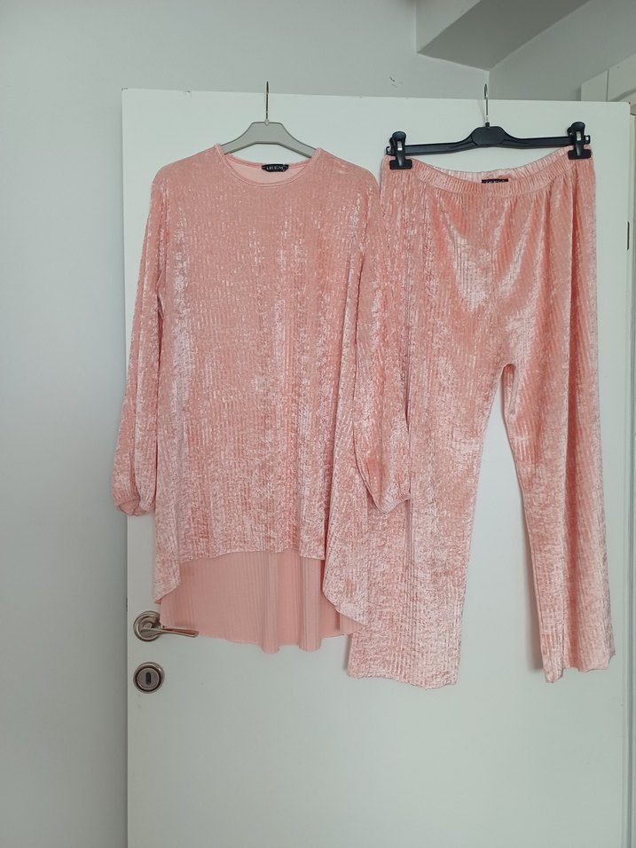 Pembe pastel renkli, uzun kollu ve salaş kesim kadın kadife takımı, pileli detaylı ve yuvarlak yaka modeldir. Günlük kullanıma uygun, yumuşak sentetik kumaştan üretilmiştir.