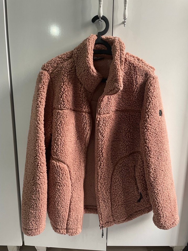 Pastel pembe renkte, yumuşak ve kürk detaylı kadın peluş ceket. Uzun kollu, normal boyda ve fitted kesimdir. Günlük kullanıma uygundur.