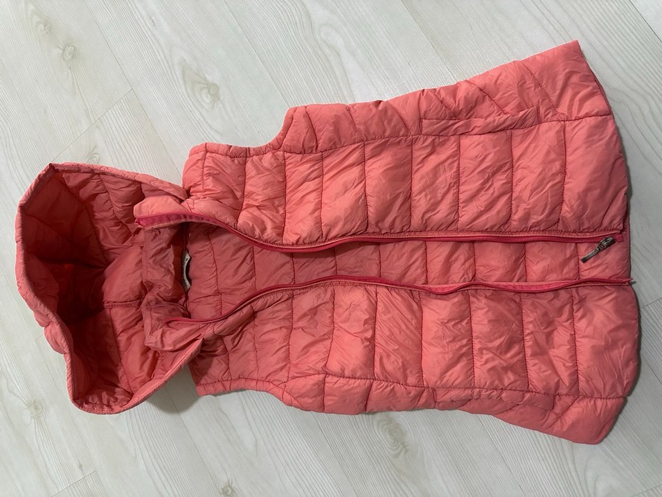 Pastel pembe renkte, fermuarlı ve yakalı, normal midi boyda, kolsuz kadın şişme yelek. Yumuşak sentetik kumaştan, rahat ve günlük kullanım için uygundur.