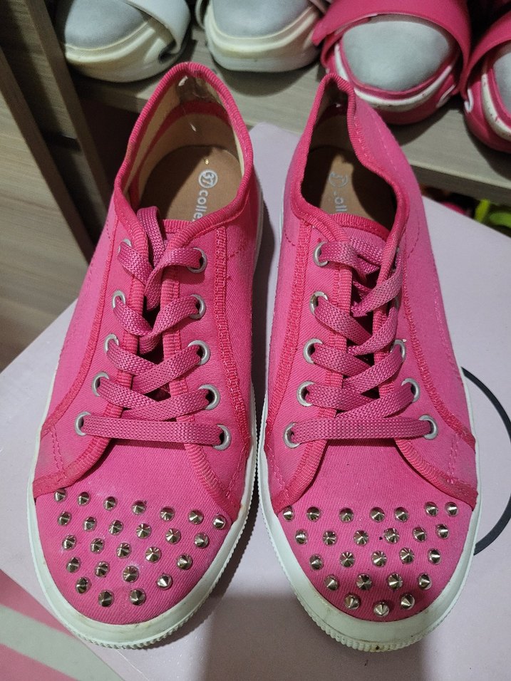 Pembe, yüksek topuklu kadın sneakers, çivili burunlu ve düğmeli detaylıdır. bez kumaş orjinal collezione'dur sayılı giyildi artık kullanmıyorum bu yüzden satıştadır
